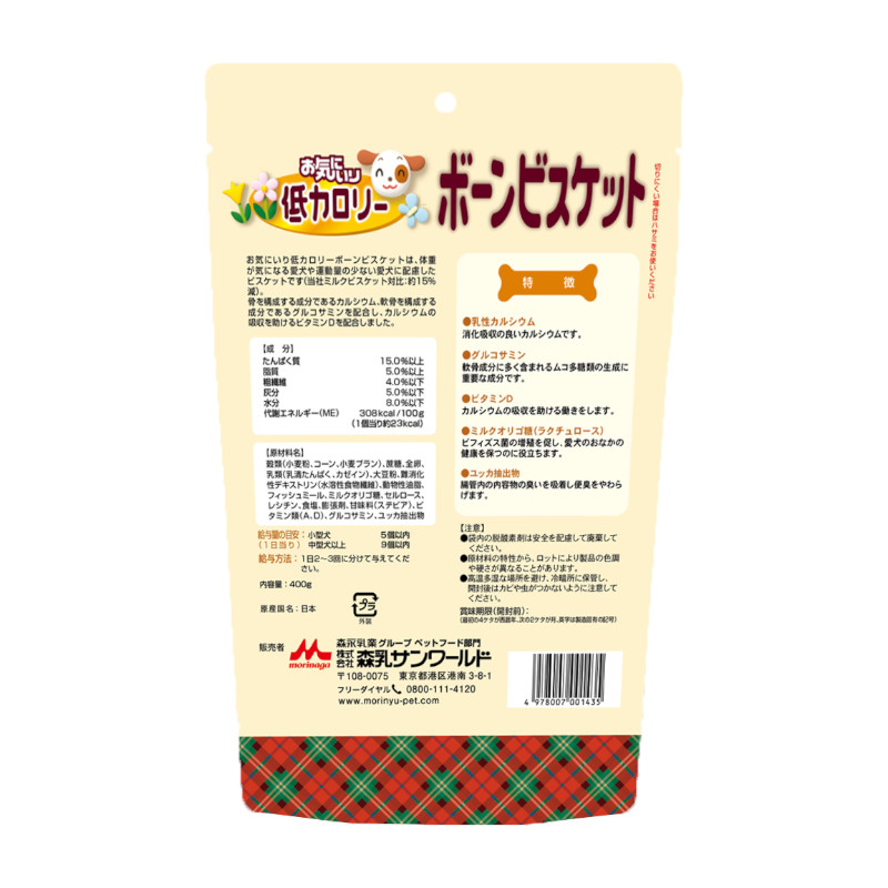 体重が気になる愛犬のために、カロリーを控えて乳性カルシウムやグルコサミン、ビタミンDを配合したビスケットです。