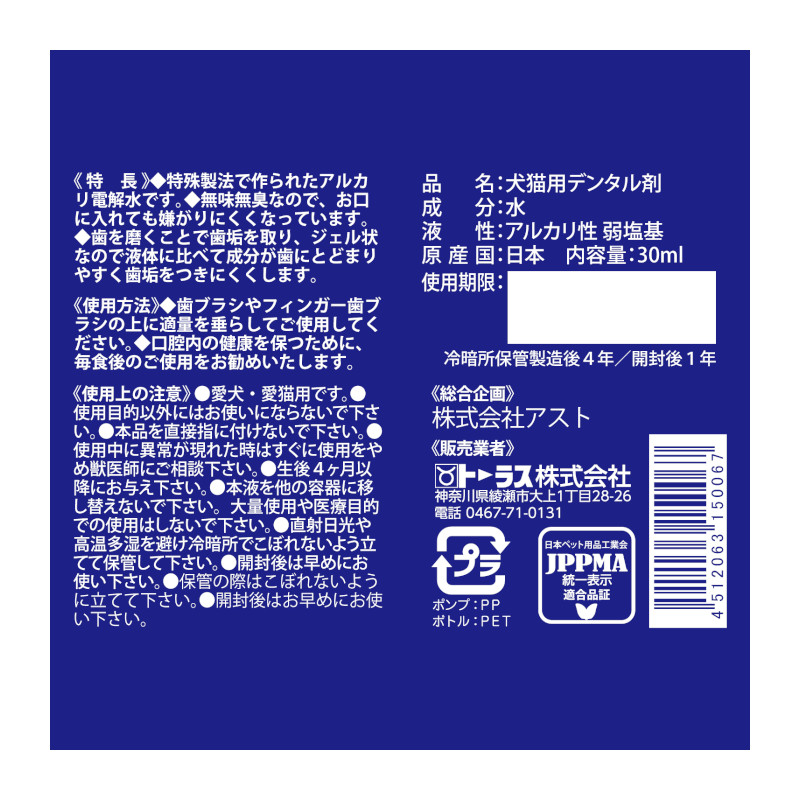 | 注意事項 | ●愛犬・愛猫用です。 ●使用目的以外にはお使いにならないで下さい。 ●使用中に異常が現れた時にはすぐに使用を止めて獣医師にご相談ください。 ●生後4ヶ月以降にお使い下さい。 ●本液を他の容器に移し替えないで下さい。 ●大量使用や医療目的での使用はしないで下さい。 ●直射日光や高温多湿を避け冷暗所でこぼれないように立てて保管して下さい。 ●開封後はお早めにお使い下さい。 |
