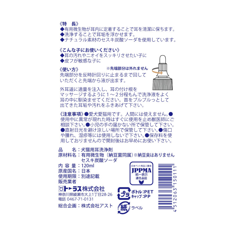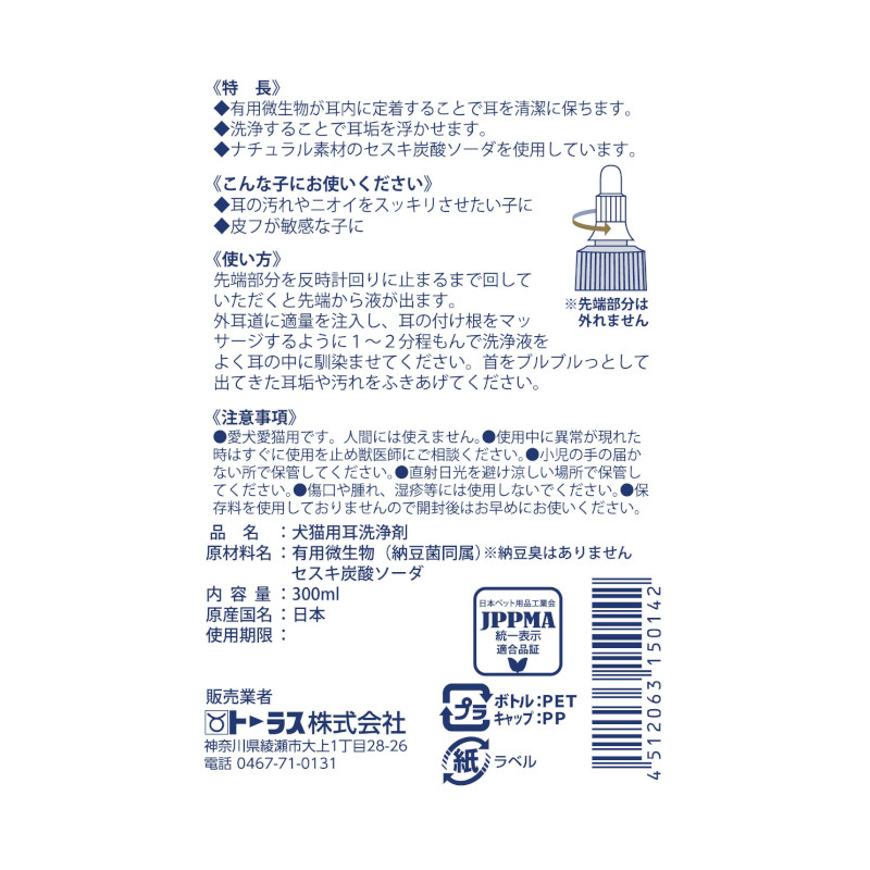 | 注意事項 | ●愛犬愛猫用です。人間には使えません。 ●使用中に異常が現れたときはすぐに使用を止め獣医師にご相談下さい。 ●小児の手の届かない所で保管して下さい。 ●直射日光を避け涼しい場所で保管して下さい。 ●傷口や腫れ、湿疹等には使用しないで下さい。 ●保存料を使用しておりませんので開封後はお早めにお使い下さい。 |
