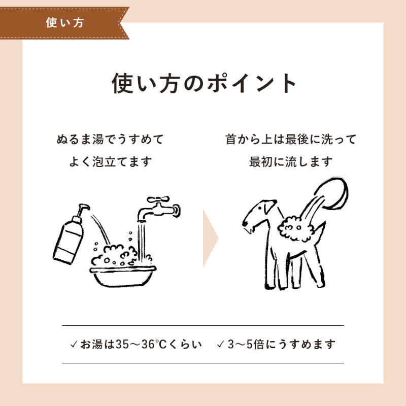 シャンプー後、体全体にコンディショナーをなじませ、数分置いた後にすすいでください。コンディショナー1:水3~5倍程度で希釈すると、毛になじませやすくなります。毛がもつれていたり毛玉になっている箇所にはよくなじませてあげると効果的です。コンディショナー使用量の目安は小型犬で10mL、中型犬で20mL、大型犬で50mLですが、毛の長さなどにより異なりますので、適宜調整してご使用ください。