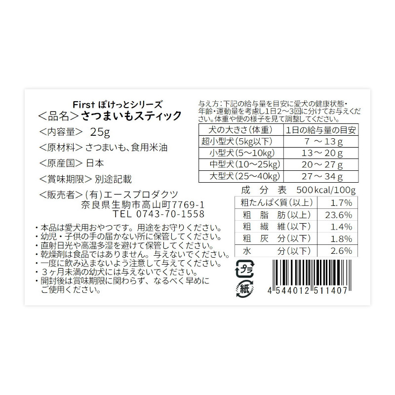 | 素材 | さつまいも、植物油脂 粗たんぱく質:2.6%以上、粗脂肪:19.7%以上、粗繊維:7.4%以、粗灰分:1.3%以下、水分:1.5%以下、カロリー:473kcal/100g |