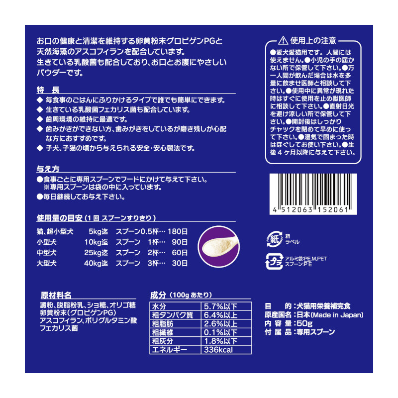 | 素材 | 澱粉、脱脂粉乳、ショ糖、オリゴ糖、卵黄粉末(グロビゲンPG)、アスコフィラン、ポリグルタミン酸、フェカリス菌 水分5.7%以下、粗タンパク質6.4%以上、粗脂肪2.6%以上、粗繊維0.1%以下、粗灰分1.8%以下、エネルギー336kal/100gあたり |