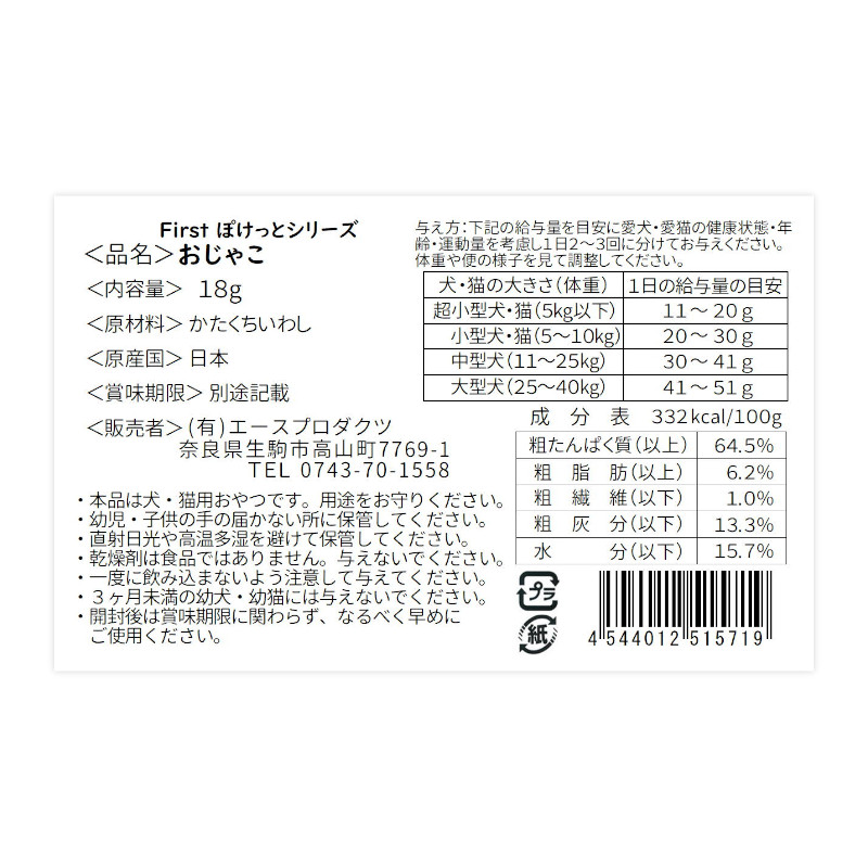 | 注意事項 | ・同封の脱酸素剤は食べられません。 ・幼児、小さなお子様の手が届かない所で保管してください。 ・3ヶ月未満のペットには与えないで下さい。 ・天然素材を使用している為、色、形、大きさにバラツキが生じることがあります。 |