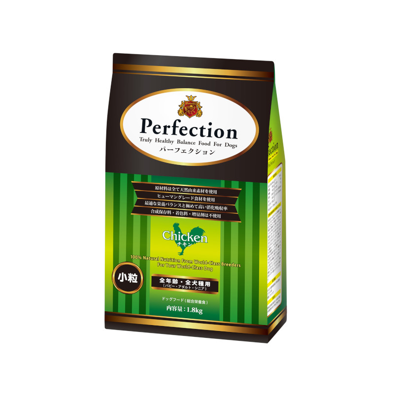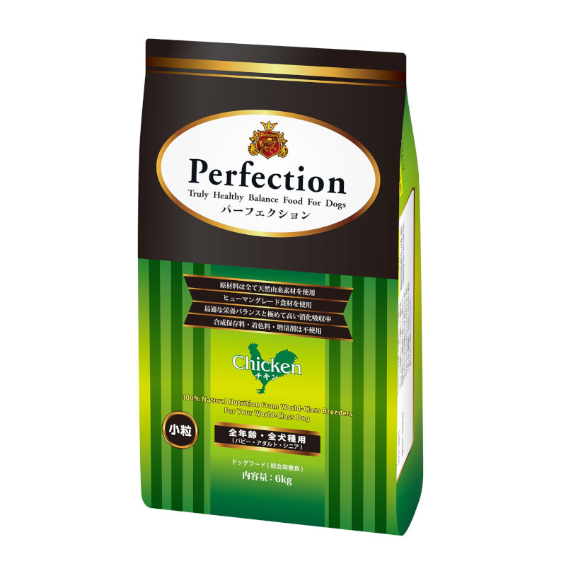 ポークは特にタンパク質の吸収率がよく体作りにおすすめです。チキンは栄養バランスがよく健康な体調と体型の維持におすすめです。サーモンは抗酸化成分が豊富で皮膚被毛のケアにおすすめです。パーフェクションは保証成分値が各種同数値の設定で、フードローテーションも簡単でおすすめです。