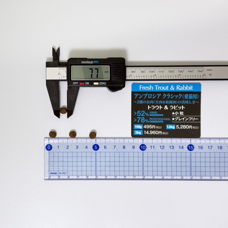 | 素材 | 【原材料】 トラウト(30%)、ドライラビット(21%)、ドライポテトフレーク、エンドウ豆、割ったエンドウ豆、ポテトタンパク、ビートパルプ、リグノセルロース、ビール酵母、加水分解酵母、サーモンオイル(1%)、ドライチコリ(FOSとイヌリンの供給源として)、ドライアップル、ドライ人参、DL-メチオニン、塩化コリン、タウリン、ドライブロッコリー、ドライほうれん草、ドライトマト、ドライクランベリー、ドライブルーベリー、ビタミンE(一部保存料として)、L-カルニチン、塩酸グルコサミン(100mg/kg)、コンドロイチン硫酸塩(100mg/kg)、亜鉛、ドライハーブ(ユッカシジゲラ、ローズマリー、ウコン、シトラス、ユーゲニア)、ビタミンB12、ビオチン、ナイアシン、パントテン酸、マンガン、ビタミンA、ビタミンB2、銅、ビタミンB1、ビタミン B6、ヨウ素、葉酸、セレン、ビタミンD3 【成分】 粗タンパク質/34.00%、粗脂肪/12.00%、粗繊維/5.50%、粗灰分/7.50%、水分/ 6.00%、カルシウム/1.40%、マグネシウム/0.09%、リン/1.00%、オメガ3脂肪酸/0.4%、オメガ 6脂肪酸/1.8%、タウリン/1500mg/kg 【エネルギー】 365.0kcal/100g |