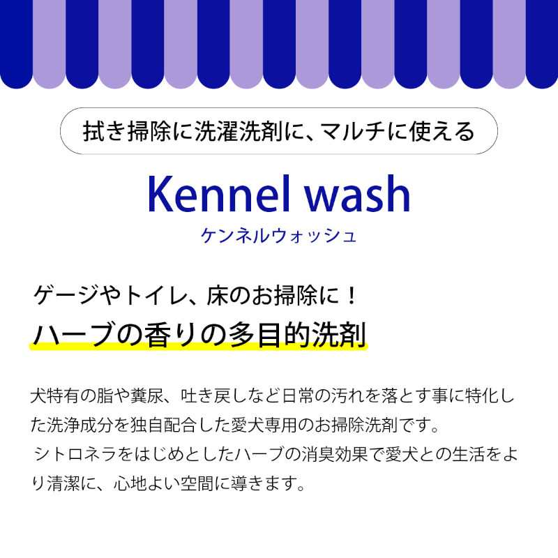 人間や愛犬、環境にもやさしい、エッセンシャルオイルの香りと消臭・洗浄効果を最大限に活かした、多目的な洗剤の「ケンネルウォッシュ」。