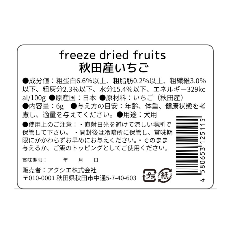 | 素材 | 【原材料】 いちご(秋田産) 【栄養成分〈100g中〉】 粗タンパク質:8.6%以上、粗脂肪:0.8%以上、粗繊維:13.6%以下、粗灰分:4.9%以下、水分:3.0%以下 【エネルギー】 330kcal/100g |