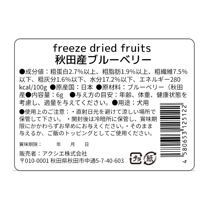 | 素材 | 【原材料】 ブルーベリー(秋田産) 【栄養成分〈100g中〉】 粗タンパク質:3.9%以上、粗脂肪:1.9%以上、粗繊維:15.1%以下、粗灰分:1.6%以下、水分:5.0%以下 【エネルギー】 350kcal/100g |