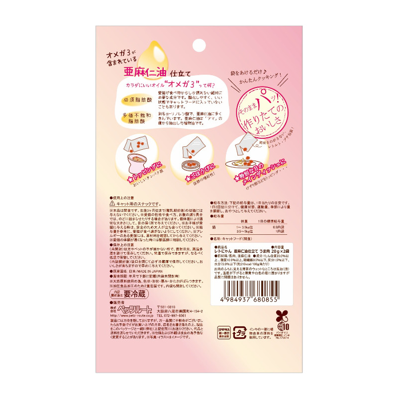 下部尿路に配慮したオメガ3脂肪酸でおいしく健康!レトルト分包なので、いつでもおいしく水分補給ができる贅沢おやつ。