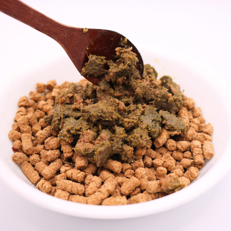 | 素材 | 原材料:エゾ鹿肉、内臓、胃内容物 たんぱく質17.3%、脂質3.0%、可溶無窒素物0.0%、粗繊維0.7%、灰分1.0%、水分76.8%、エネルギー86kcal/100g |