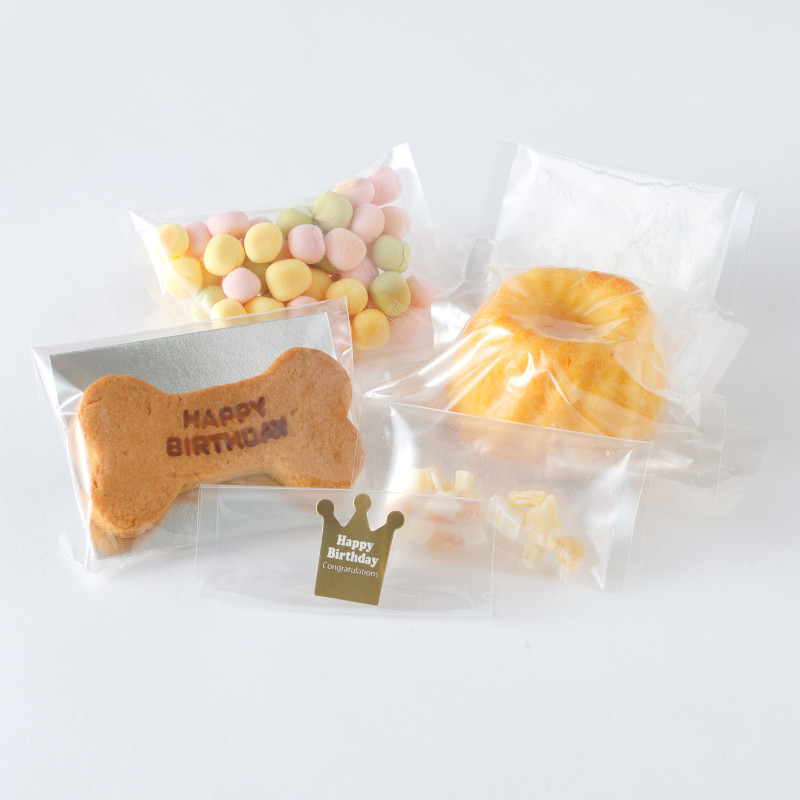 ケーキ・ドライフルーツ・粉糖・骨型クッキー・ミックスぼーろ・王冠ピックを詰め合せた、ワンちゃん用の手作りケーキセットです。