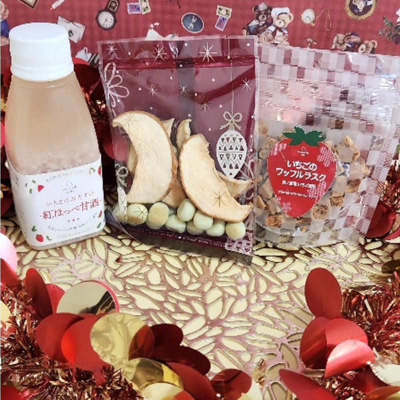 いちごのワッフルラスク、クリスマス仕様のりんごすらいす&青りんごボーロ、いちごのあまざけの3種類をセットにしました。