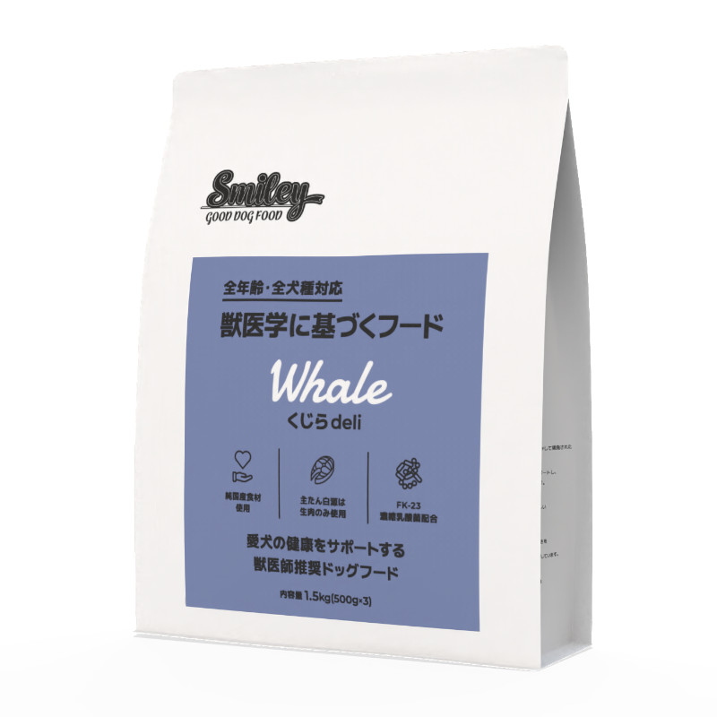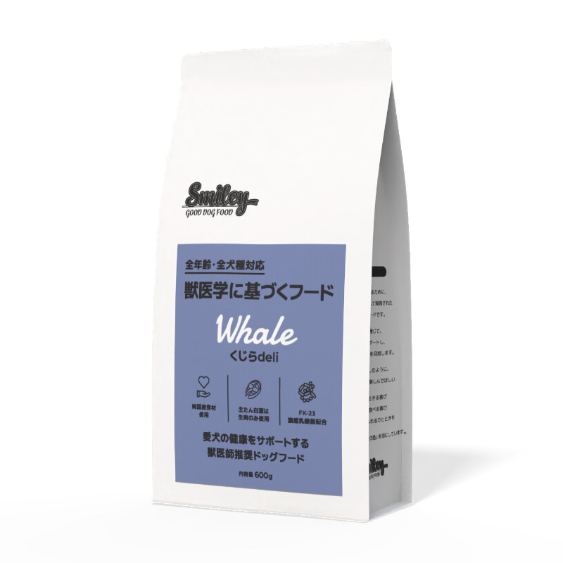 | 素材 | 【原材料】 鯨肉、大麦、青玄米、かつお節、なたね油、ブロッコリー、小松菜、ワカメ、ひじき、粟、ビール酵母、卵殻カルシウム、FK-23濃縮乳酸菌 【保証成分値】 粗蛋白:22.0%以上 粗脂肪:9.0%以上 粗繊維:0.5%以下 水分:5.8%以下 粗灰分:3.3%以下 【エネルギー】 361kcal/100g |