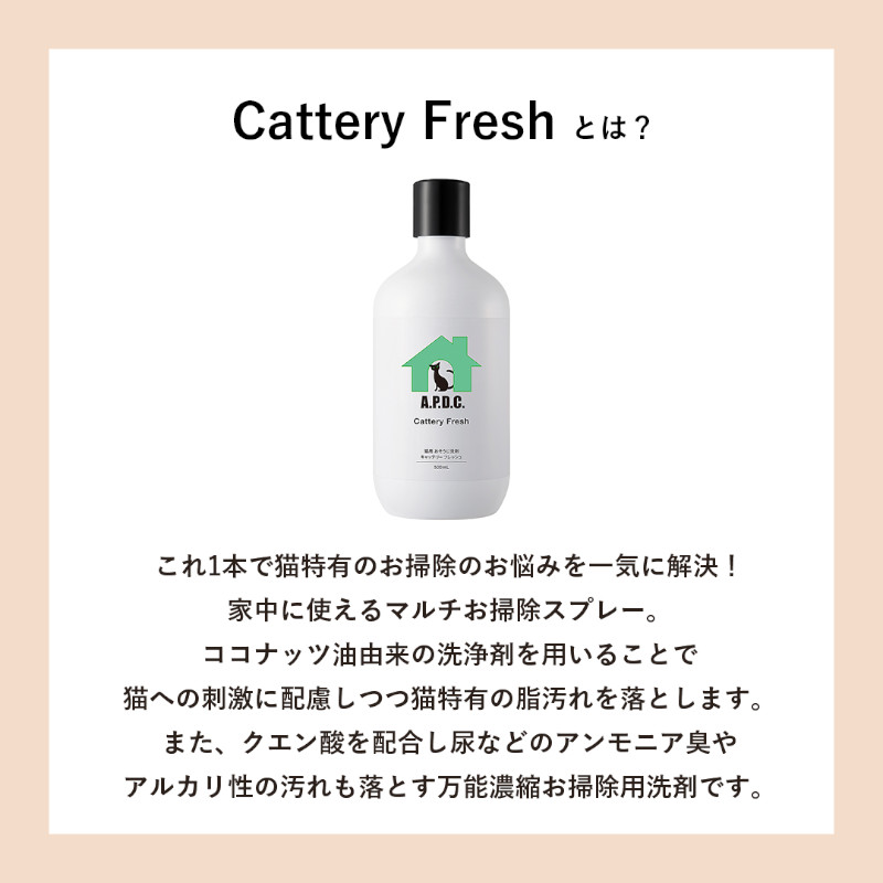 ペットとの生活の悩みの中でも上位に当たる「汚れ」「ニオイ」。毎日思いっきり掃除をしたいですよね!どんなに汚れ落ちが良くても価格が高いと上記の悩みは解決されません・・。そこでキャッテリー フレッシュは10倍希釈で1本240円と、使いやすい価格設定に致しました!多頭飼いのお家でもじゃぶじゃぶ使用していただけます。