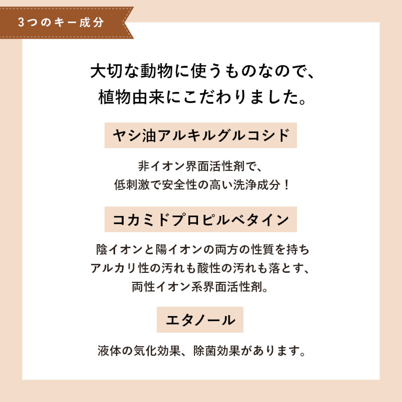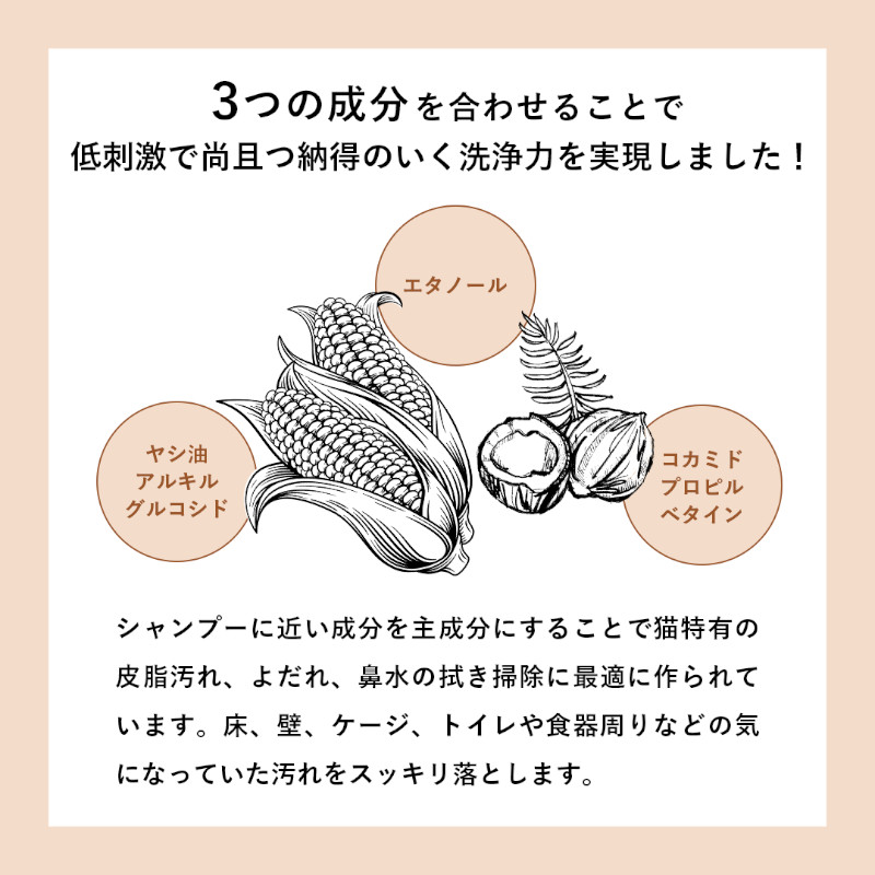 ココナッツ油由来の洗浄剤を用いることで猫への刺激に配慮しつつ猫特有の脂汚れを落とします。また、クエン酸を配合し尿などのアンモニア臭やアルカリ性の汚れも落とすので、これ1本で猫特有のお掃除のお悩みを一気に解決する万能濃縮お掃除用洗剤です。