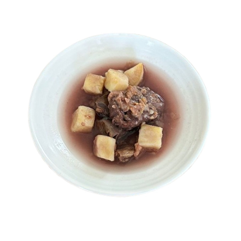 高たんぱく・低脂質の鹿肉と、さつまいものダイス、ラズベリーのシチューです。柔らくなった鹿肉に、ほんのり甘いピンク色のスープがよく合います。湯煎で少し温めると、さらに良い香りに。保存食としてもどうぞ。
