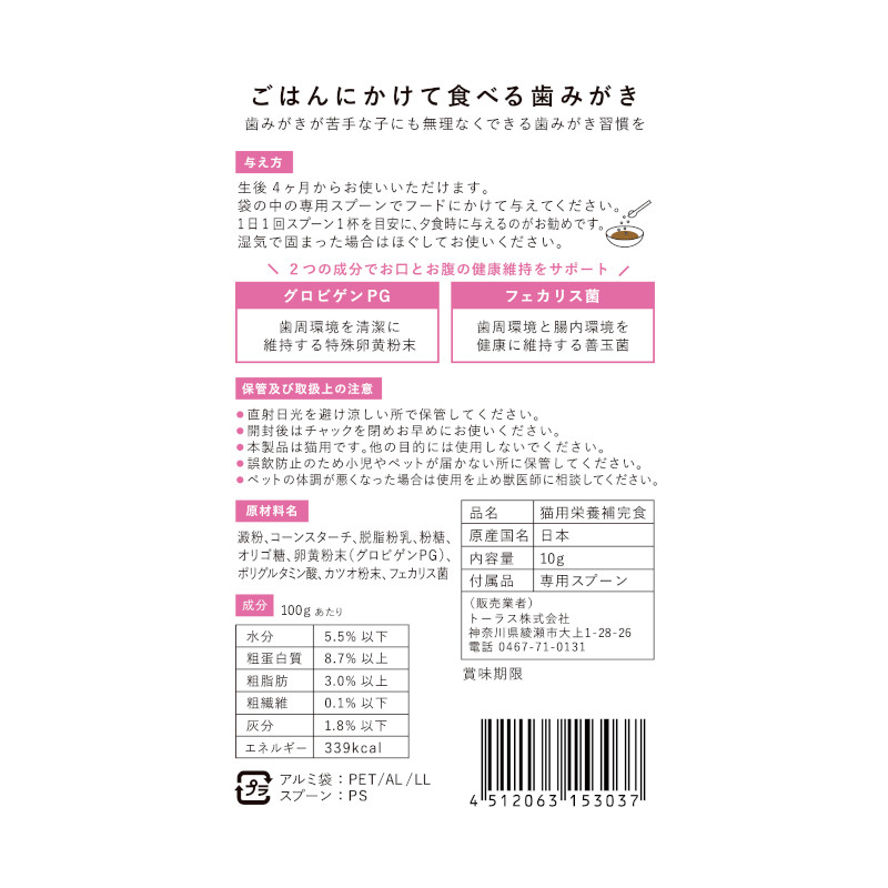 歯みがきが苦手な猫ちゃんに卵黄粉末グロビゲンPG配合。かつお味パウダー