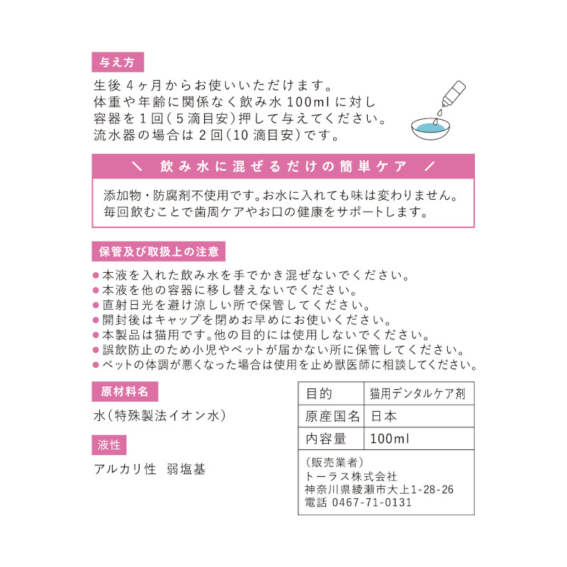| 注意事項 | 【保管及び取扱上の注意】 ●本品を入れた飲み水を手でかき混ぜないでください。 ●本品を他の容器に移し替えないでください。 ●直射日光を避け涼しい所で保管してください。 ●開封後はキャップを閉めお早めにお使いください。 ●本製品は猫用です。他の目的には使用しないでください。 ●誤飲防止のため小児やペットが届かない所に保管してください。 ●ペットの体調が悪くなった場合は使用を止め獣医師にご相談ください。 |