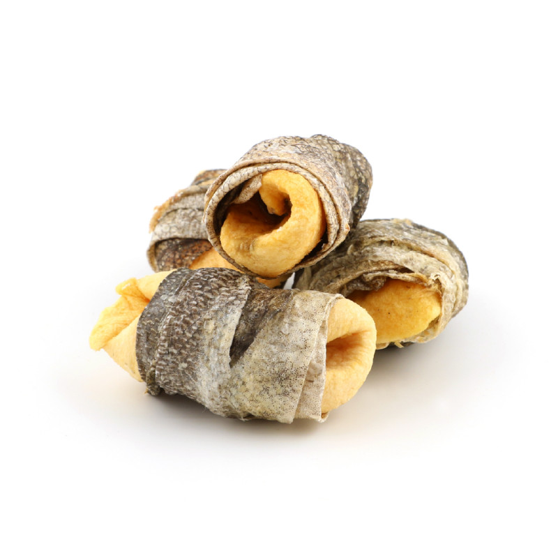 食物繊維、ビタミンC、K、B6が豊富なりんごをホワイトフィッシュの皮で巻いたシンプルなトリーツ