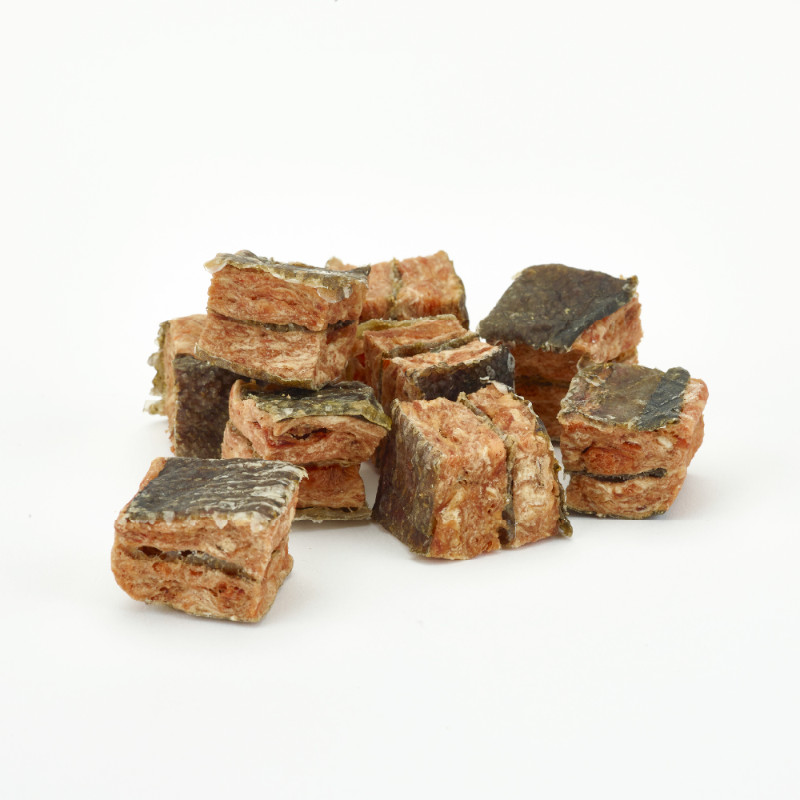 人気のサーモンとホワイトフィッシュの皮をキューブ状に成形したトリーツ