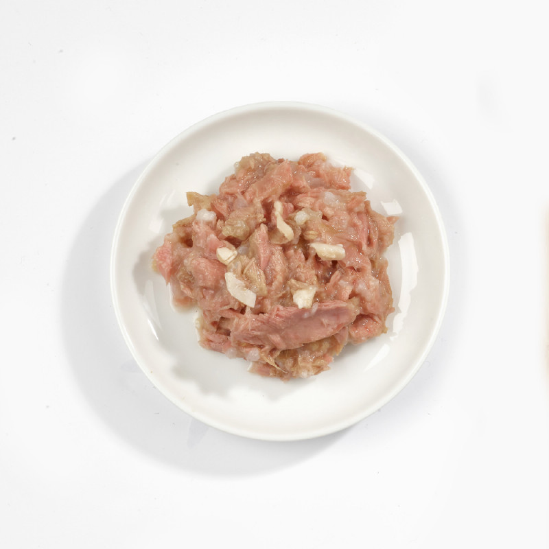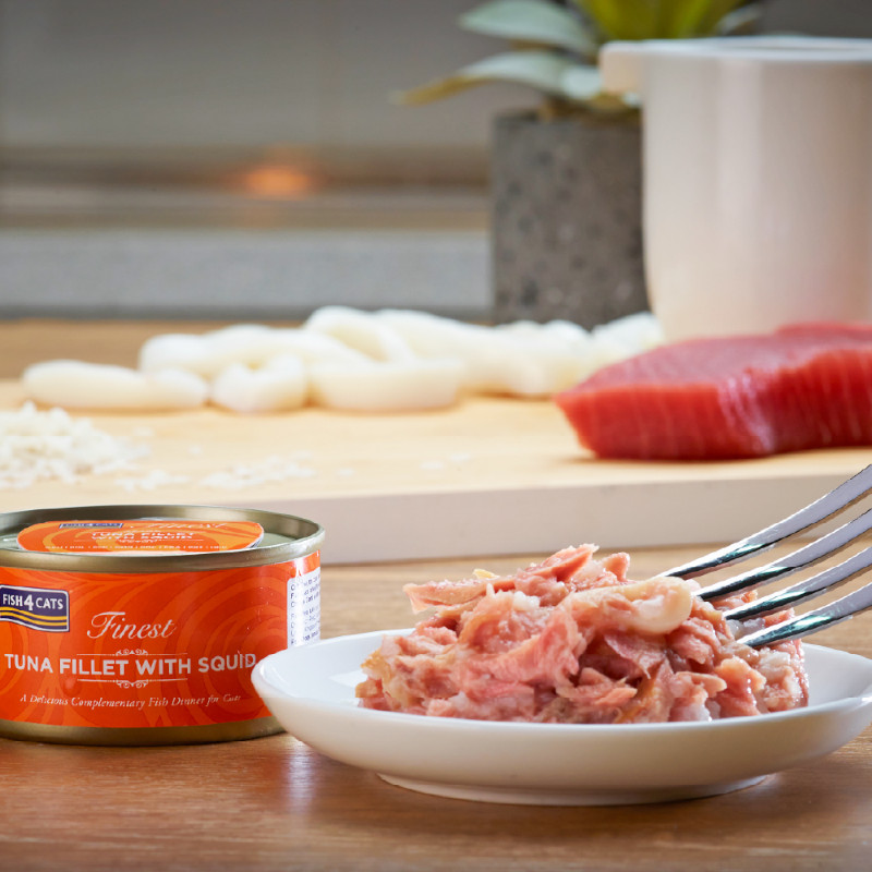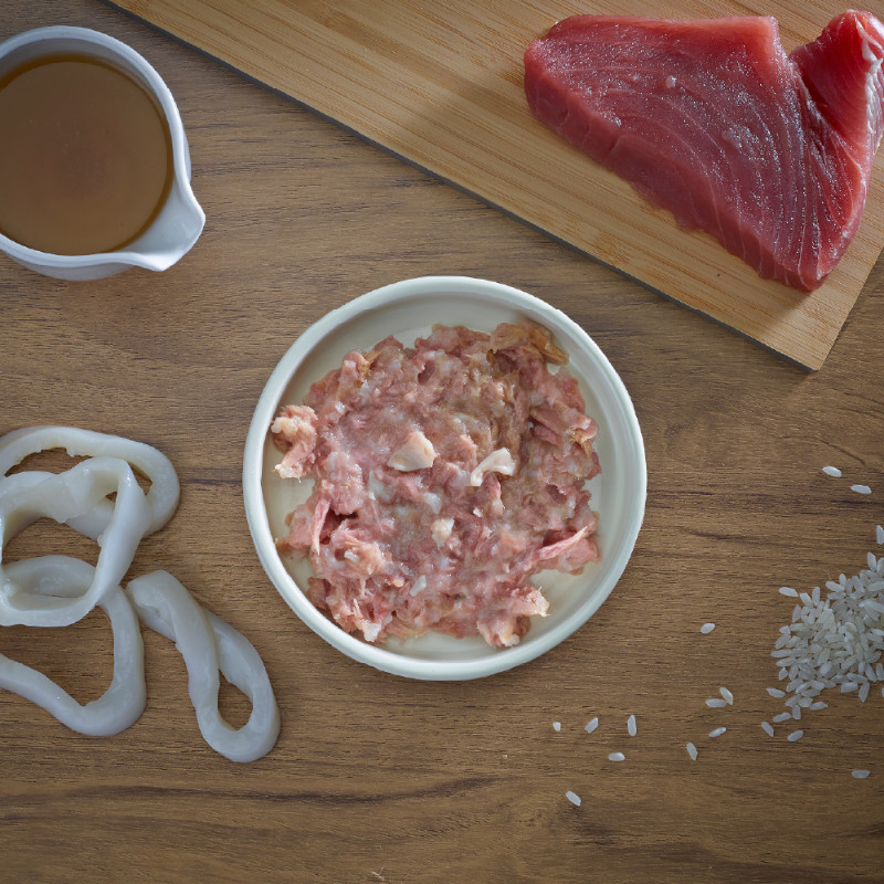 ツナベースにイカと栄養抜群のフィッシュスープを含めた贅沢なウェットフード