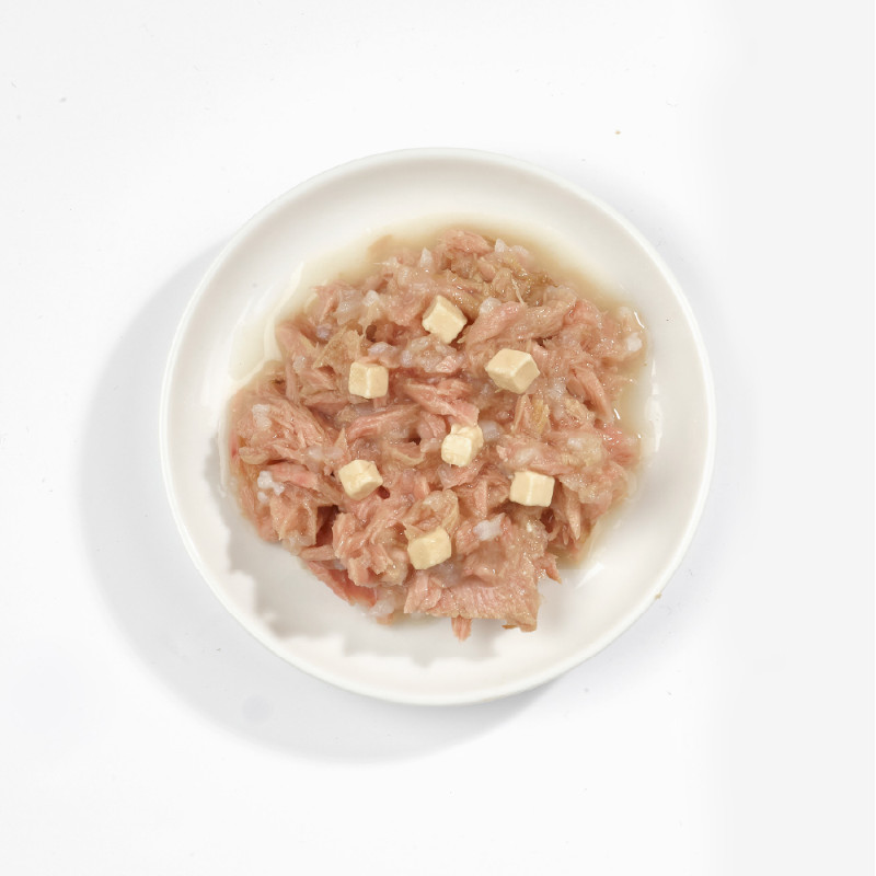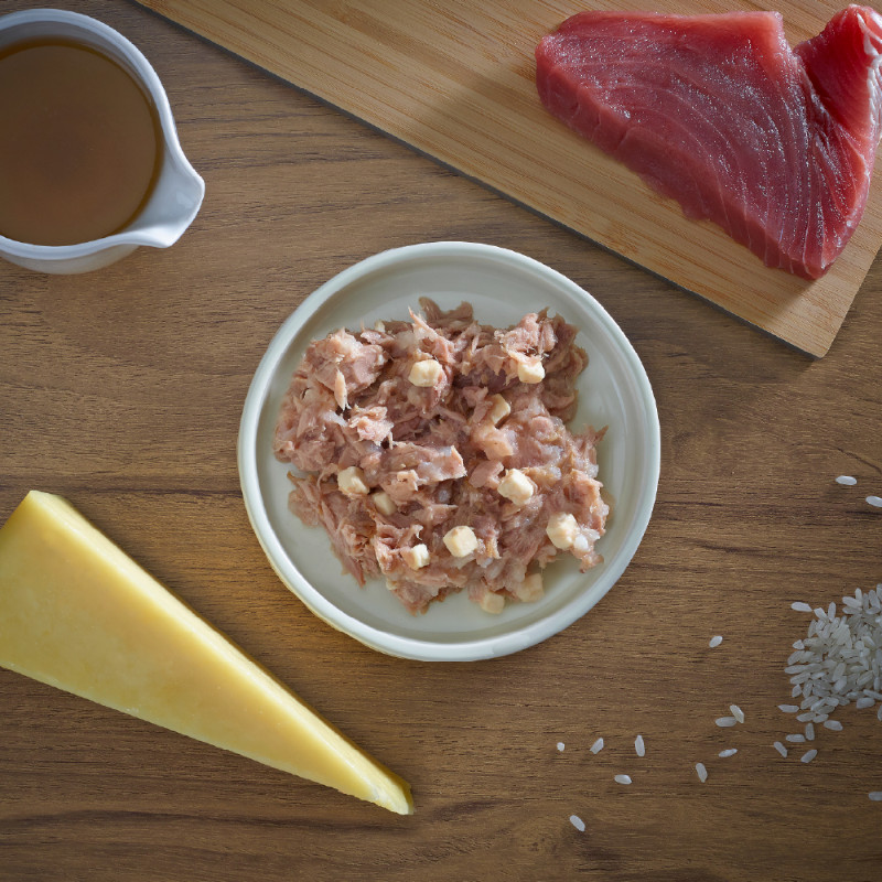 ツナベースにチーズと栄養抜群のフィッシュスープを含めた贅沢なウェットフード