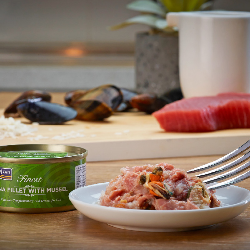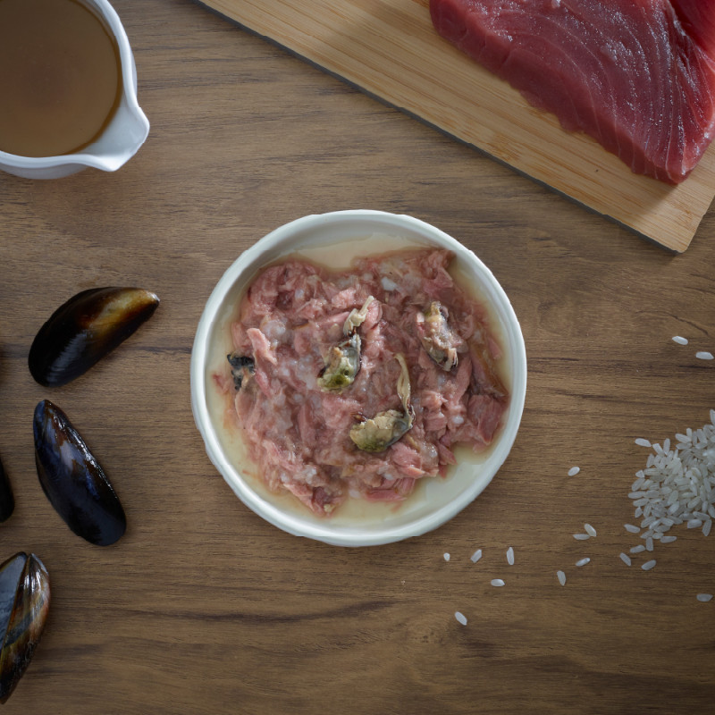 ツナベースにムール貝と栄養抜群のフィッシュスープを含めた贅沢なウェットフード