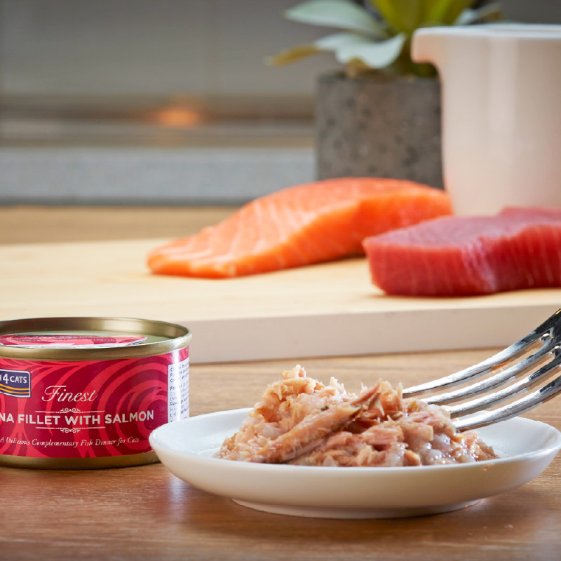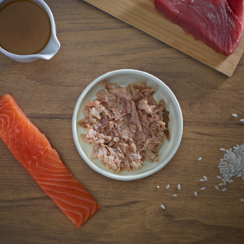 ツナベースにサーモンと栄養抜群のフィッシュスープを含めた贅沢なウェットフード