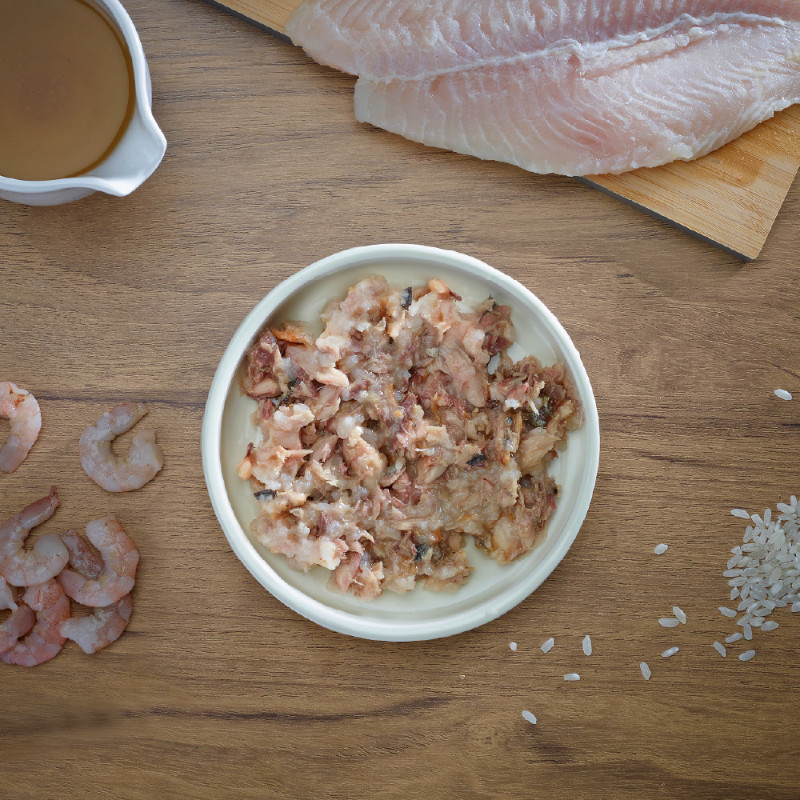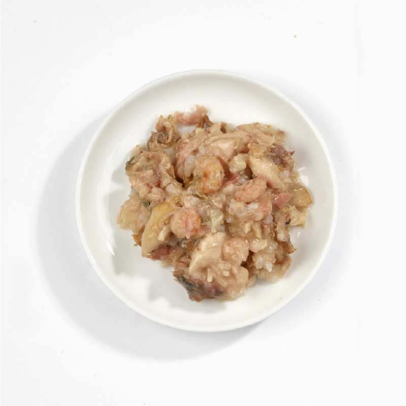 サバベースに小エビと栄養抜群のフィッシュスープを含めた贅沢なウェットフード
