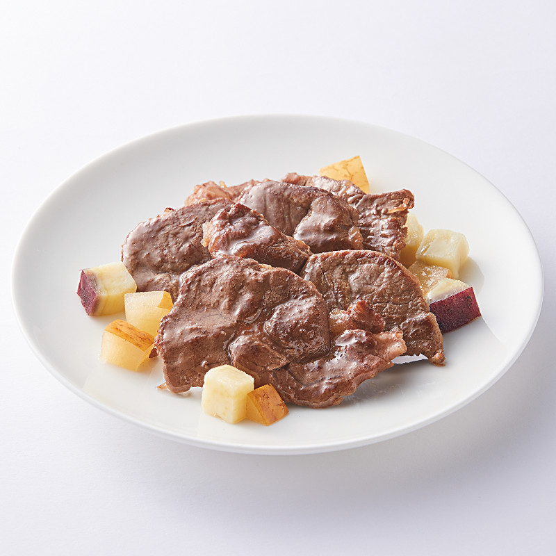食べ応えのある馬肉のステーキに、ワンちゃんも好きなさつまいもとりんごを添えた惣菜59種類の栄養素をもつユーグレナ配合。