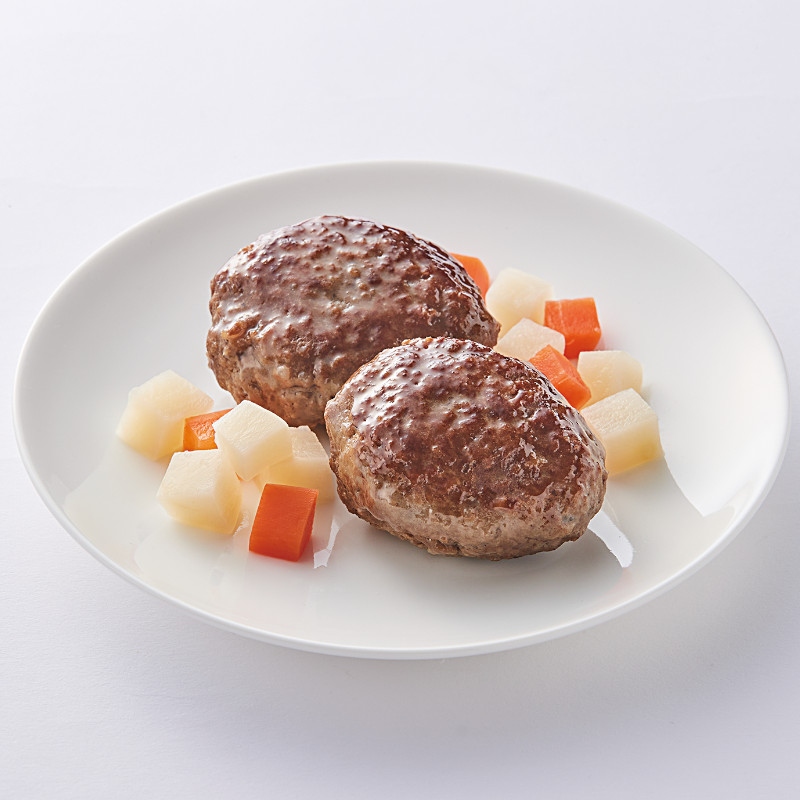 牛肉のハンバーグとしっかりとお野菜も摂取できるよう人参とじゃがいもを添えたお惣菜。59種類の栄養素をもつユーグレナ配合。