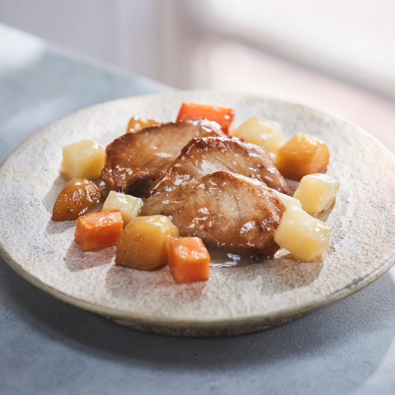 良質なタンパク質とDHA、EPA豊富な鮪のステーキ。じゃがいもとニンジンを添えて彩り鮮やか。