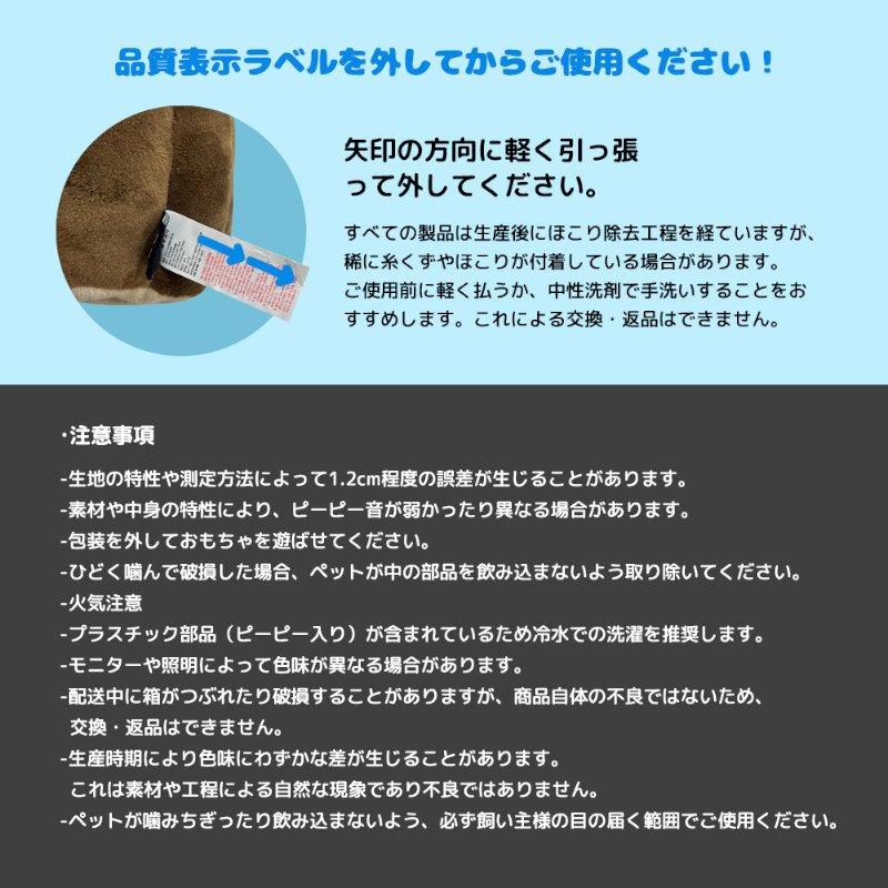 | 注意事項 | ・素材の特性と測定方法により、1~2cmの誤差が生じる場合があります。 ・素材の特性上、ピーピー音が弱かったり、音が異なる場合があります。 ・包装を外して、おもちゃとして遊ばせてください。 ・小さな部品や強く噛んで壊れた場合は、ペットが中身を飲み込まないよう、破棄してください。 ・ペットが噛みちぎったり飲み込まないよう、必ず飼い主様の目の届く範囲でご使用ください。 ・火気注意 ・プラスチック部品(ピーピー音)入りの製品は冷水での洗濯をおすすめします。 ・モニターの機種や解像度、室内照明によって色に差異がある場合があります。 ・宅配便での発送時に、商品箱がつぶれたり破損する場合がございますが、こちらは商品本体の不良ではございません。 そのため、箱の破損による交換・返品はお受けできかねます。 ・生産時期により、カラーに若干の違いが生じる場合がございます。 これは素材や製造工程の特性によるもので、不良ではございませんので、あらかじめご了承ください。 ・商品にご使用の痕跡があり、破損・汚損が見受けられる場合は、交換・返品をお受けできません。 |