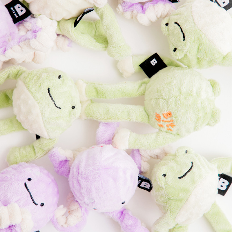 細長いカエルの手足は、引っ張りっこ遊びも楽しめます。
