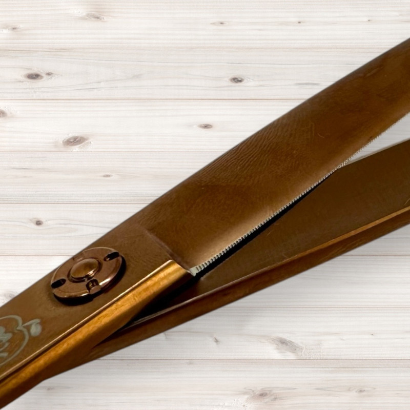 | 素材 | ・サイズ:7インチ ・ブレードタイプ:ギザ刃ストレートシザー ・カラー:ブロンズ ・材質:440JP ・全長:19㎝ ・刃長:9㎝ ・重量:約69g ・付属品:シザーケース、専用ネジ、クロス |