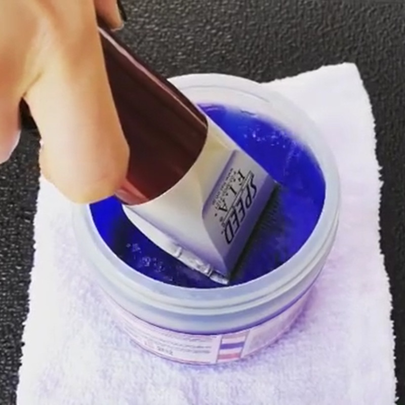 替刃をバリカンに装着し、スイッチを入れた状態でH-42に刃先を10秒ほど浸てください。刃と刃のあいだに溜まった目に見えない皮脂や汚れを洗い流します。