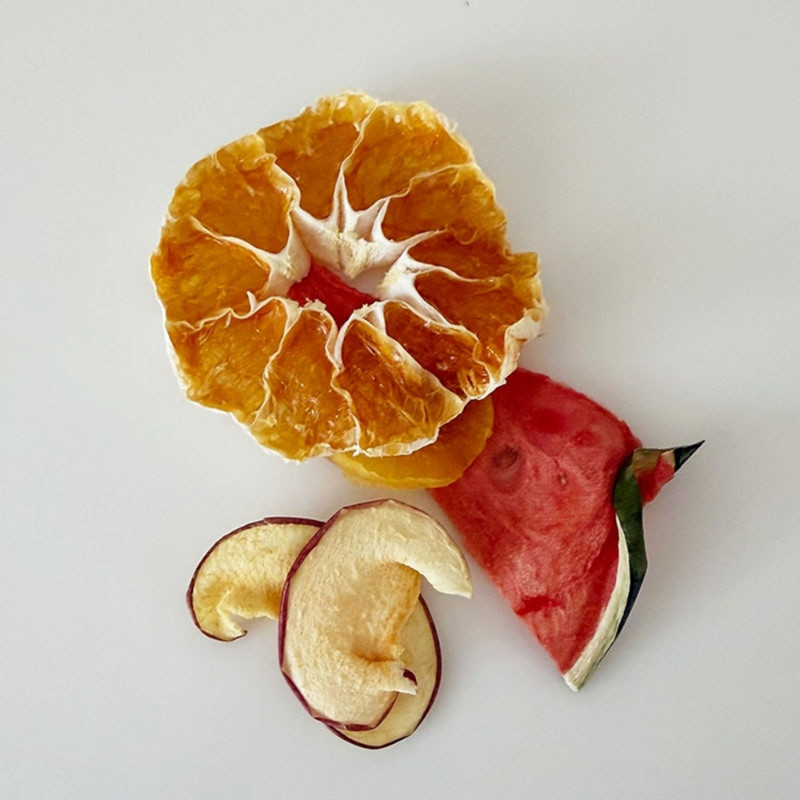 ※りんごは変色防止のため、1%食塩水に数秒潜らせています。メロン・スイカは乾燥途中に糖分が褐変することがありますが、品質に問題はありません。