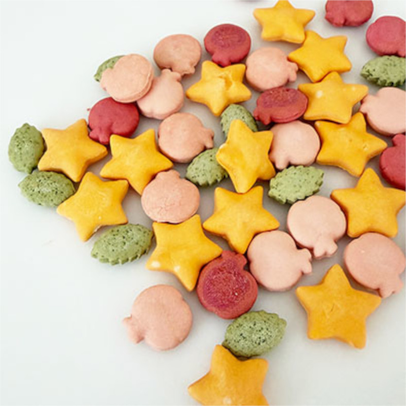 | 素材 | 【原材料】 薄力粉、なたね油、にんじん、ビーツパウダー、りんごジュース、パセリ、大麦若葉、ベニコウジ色素、パプリカ色素 【栄養成分値100g中(計算値)】 タンパク質 8.6% 脂質 5.0% 繊維 2.6% 灰分 0.4% 水分 6.8% 【エネルギー】 熱量 349kcal |