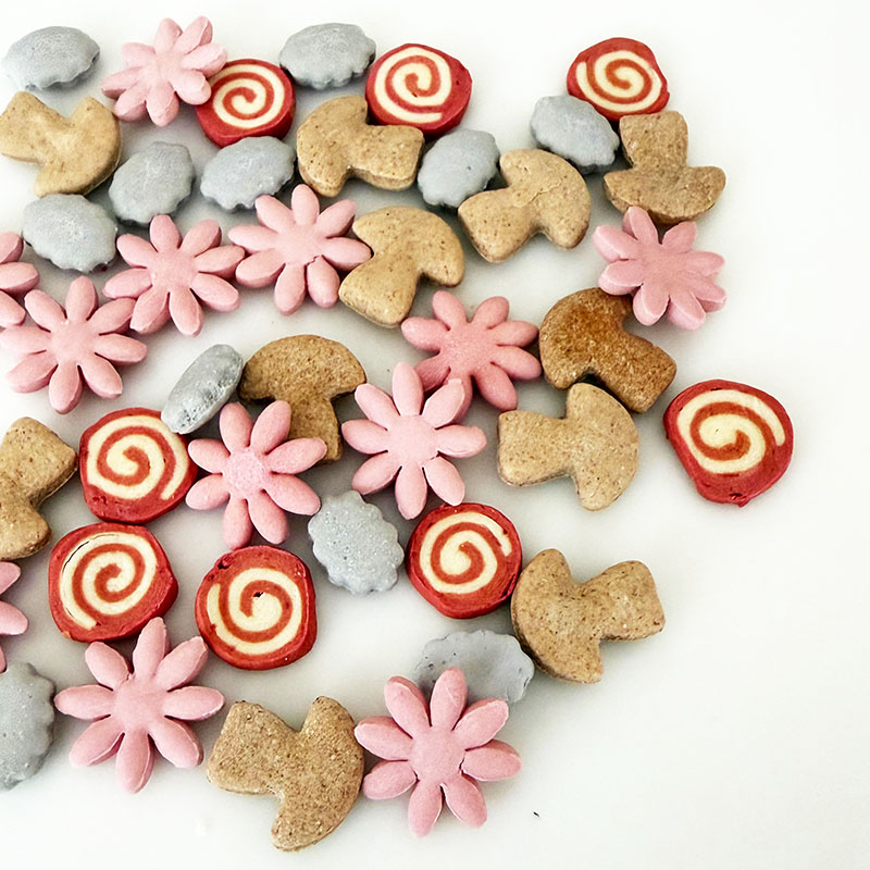 | 素材 | 【原材料】 薄力粉、全粒粉、なたね油、キャロブパウダー、赤ダイコン色素、しいたけパウダー、ビーツパウダー、こんにゃくパウダー、ビーツ、バタフライピー色素 【栄養成分値100g中(計算値)】 タンパク質 9.1% 脂質 5.5% 繊維 3.4% 灰分 0.5% 水分 5.6% 【エネルギー】 熱量 356kcal |