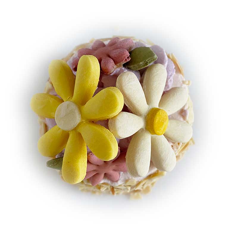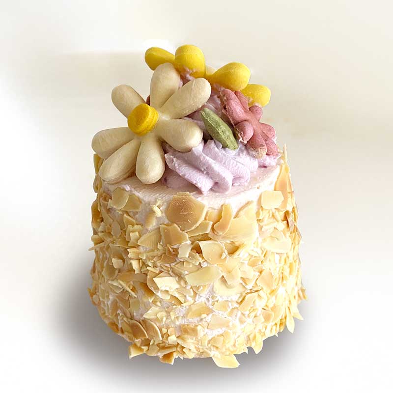 ふわふわのケーキに、ローストしたアーモンドスライスをまぶして花束のように飾りました。