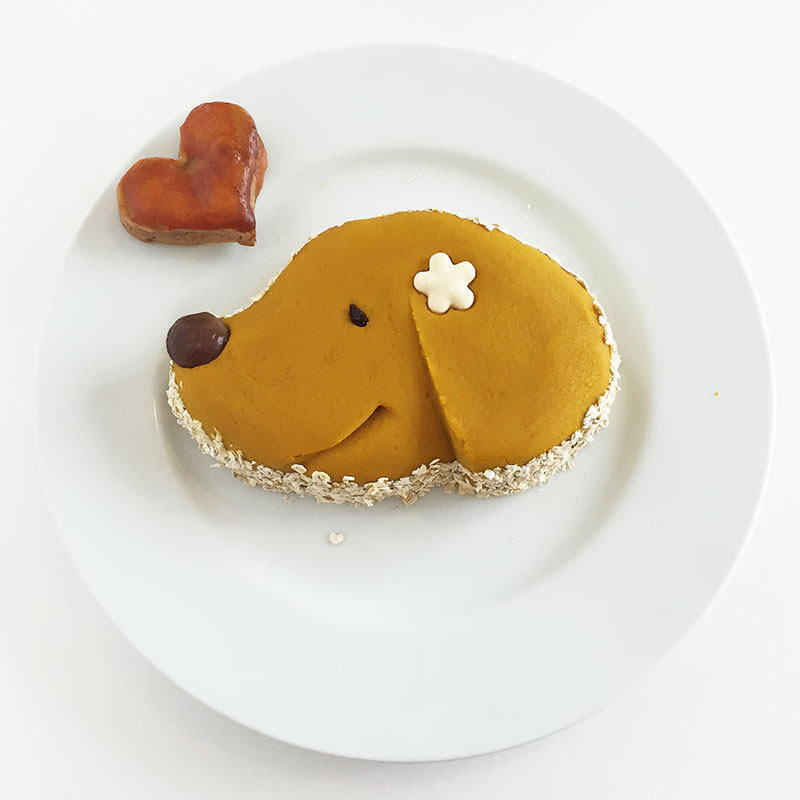 すりおろした人参を混ぜ込んで焼いたスポンジケーキ、かぼちゃと豆乳のペースト、周りには消化しやすいオートミールをまぶした、ヘルシーなケーキ。
