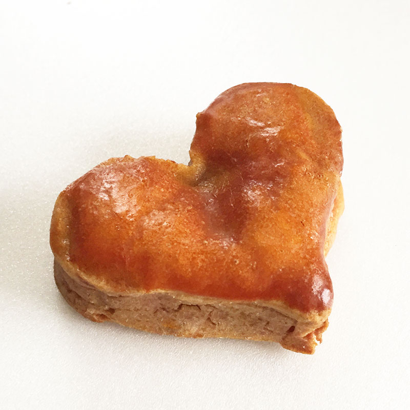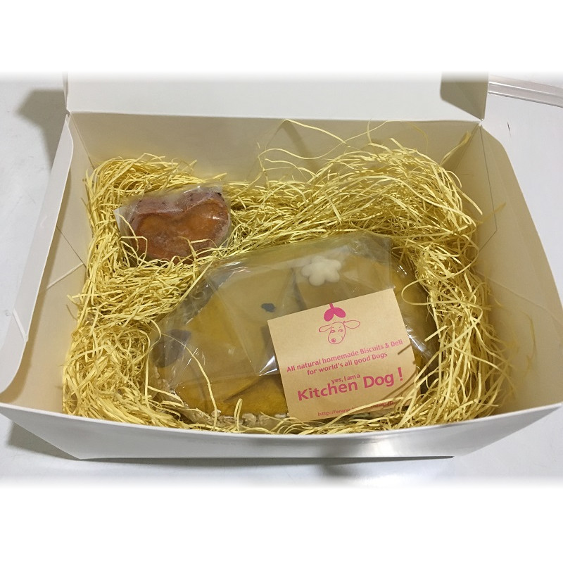 | 素材 | 【原材料】 本体:薄力粉、鶏卵、キャノーラ油、豆乳、にんじん、カボチャ、オートミール、甘栗、エダムチーズ、コーンフラワー、スキムミルク、ドライカシス ハート:薩摩芋、鶏卵、紅麹 【エネルギー】 本体:約440kcal ハート:約44kcal |