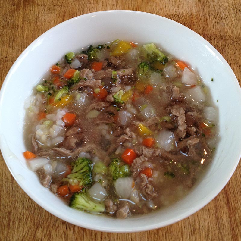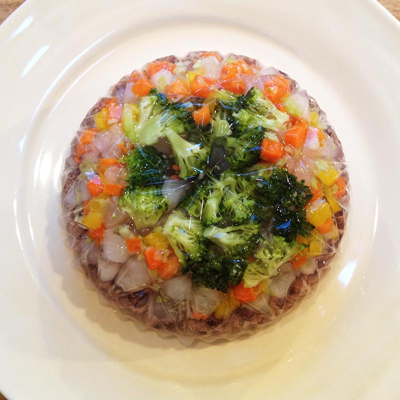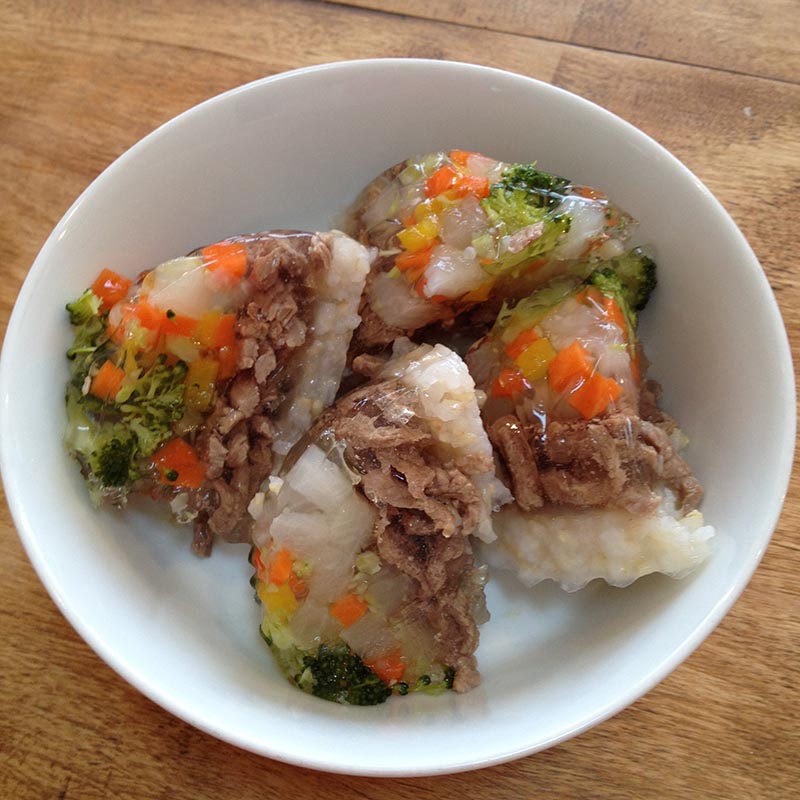 柔らかく炊いた発芽玄米、馬肉もしくは鶏の胸肉、各種旬のビタミンたっぷりな野菜がたくさん入って、寒天寄せになっています。