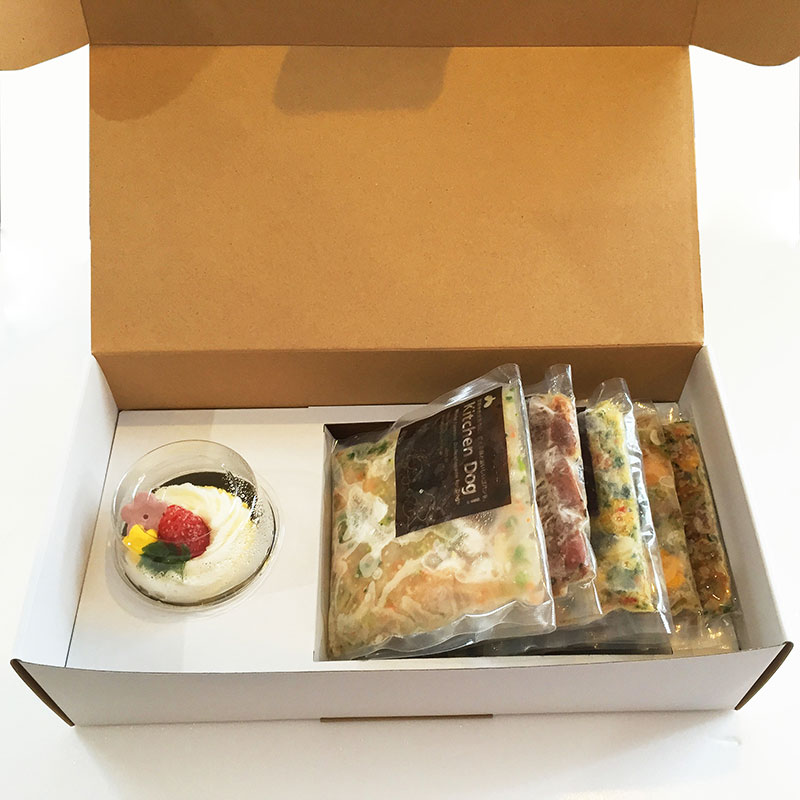 わんちゃんのために、特別に用意した6種類の手作りごはんに、ちょっとしたデザートをプラス。