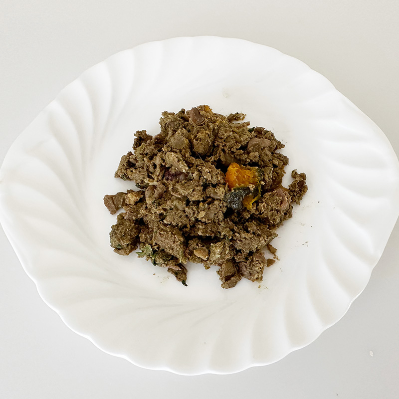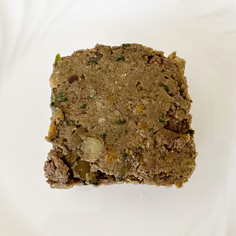 | 素材 | 【原材料】 鹿肉、りんご、豚レバー、レンズ豆、かぼちゃ、小松菜、小麦胚芽、イワシ煮干し、卵黄、オリーブオイル、昆布出汁、亜麻仁油、緑茶、卵殻カルシウム 【成分】 タンパク質:14% 脂質:5% 炭水化物:10% 灰分:13.4g ○乾物換算比 タンパク質:35% 脂質:12% 炭水化物:26% リン:0.78% カルシウム:0.91% 【エネルギー(100gあたり)】 約160kcal |