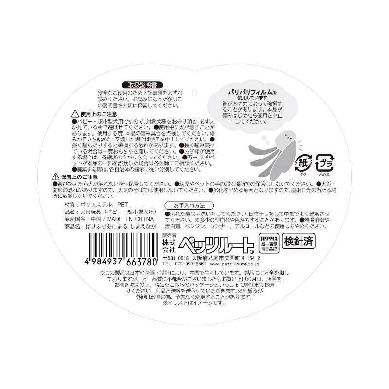 | 注意事項 | ※パリパリフィルムを使用しています。遊び方や力によって破損することがあります。本品が傷みはじめたら使用を中止してください。 【使用上の注意】 ●パピー・超小型犬用ですので、対象犬種をお守り頂き、必ず人が見ている所で遊ばせてください。 ●使用中に犬が壊すことがあります。使用する度、本品の傷み具合を点検してください。傷みが目立ち始めた、又壊した場合は使用を中止してください。 ●強く噛んだりすると破損する恐れがあります。 ●長く噛み続けている場合は一度おもちゃを離してください。 ●お子様が使用する場合は、保護者の方が立ち会ってください。 ●万一、人やペットが本品の一部を誤飲した場合は各医師にご相談ください。 ●廃棄する際は、各自治体の指示に従い分別してください。 【保管上の注意】 ●遊び終えたら犬が触れない所へ保管してください。 ●幼児やペットの手の届く場所での保管はしないでください。 ●火災・変形の恐れがありますので、火気のそばでは使用しないでください。 ●劣化を早める原因となりますので、直射日光の当たる場所に放置しないでください。 【お手入れ方法】 ●汚れた際は手洗いをしてください。日陰干しをして中までよく乾燥させてください。 ※多少の型崩れや色落ちすることがあります。 ●熱湯消毒や漂白剤、ベンジン、シンナー、アルコールなどの使用はおやめください。 |