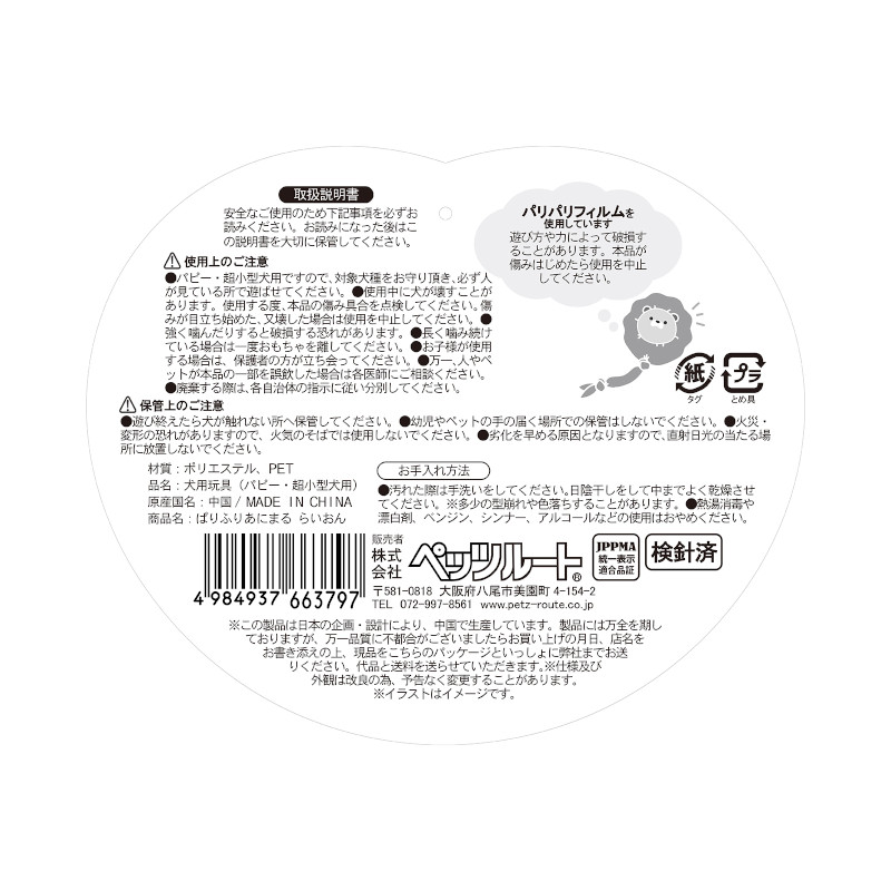 | 注意事項 | ※パリパリフィルムを使用しています。遊び方や力によって破損することがあります。本品が傷みはじめたら使用を中止してください。 【使用上の注意】 ●パピー・超小型犬用ですので、対象犬種をお守り頂き、必ず人が見ている所で遊ばせてください。 ●使用中に犬が壊すことがあります。使用する度、本品の傷み具合を点検してください。傷みが目立ち始めた、又壊した場合は使用を中止してください。 ●強く噛んだりすると破損する恐れがあります。 ●長く噛み続けている場合は一度おもちゃを離してください。 ●お子様が使用する場合は、保護者の方が立ち会ってください。 ●万一、人やペットが本品の一部を誤飲した場合は各医師にご相談ください。 ●廃棄する際は、各自治体の指示に従い分別してください。 【保管上の注意】 ●遊び終えたら犬が触れない所へ保管してください。 ●幼児やペットの手の届く場所での保管はしないでください。 ●火災・変形の恐れがありますので、火気のそばでは使用しないでください。 ●劣化を早める原因となりますので、直射日光の当たる場所に放置しないでください。 【お手入れ方法】 ●汚れた際は手洗いをしてください。日陰干しをして中までよく乾燥させてください。 ※多少の型崩れや色落ちすることがあります。 ●熱湯消毒や漂白剤、ベンジン、シンナー、アルコールなどの使用はおやめください。 |