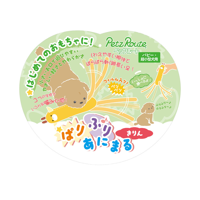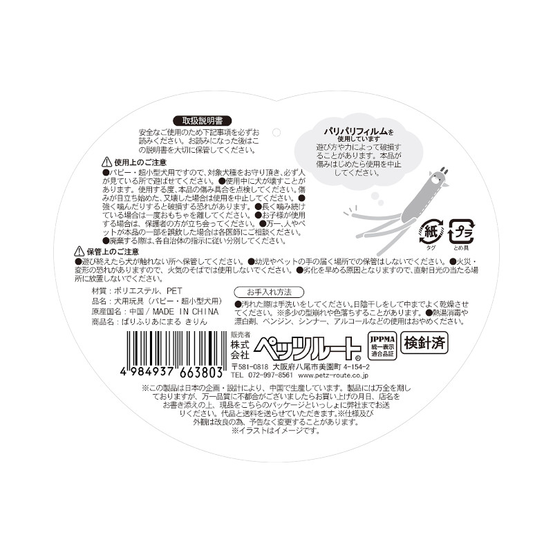 | 注意事項 | ※パリパリフィルムを使用しています。遊び方や力によって破損することがあります。本品が傷みはじめたら使用を中止してください。 【使用上の注意】 ●パピー・超小型犬用ですので、対象犬種をお守り頂き、必ず人が見ている所で遊ばせてください。 ●使用中に犬が壊すことがあります。使用する度、本品の傷み具合を点検してください。傷みが目立ち始めた、又壊した場合は使用を中止してください。 ●強く噛んだりすると破損する恐れがあります。 ●長く噛み続けている場合は一度おもちゃを離してください。 ●お子様が使用する場合は、保護者の方が立ち会ってください。 ●万一、人やペットが本品の一部を誤飲した場合は各医師にご相談ください。 ●廃棄する際は、各自治体の指示に従い分別してください。 【保管上の注意】 ●遊び終えたら犬が触れない所へ保管してください。 ●幼児やペットの手の届く場所での保管はしないでください。 ●火災・変形の恐れがありますので、火気のそばでは使用しないでください。 ●劣化を早める原因となりますので、直射日光の当たる場所に放置しないでください。 【お手入れ方法】 ●汚れた際は手洗いをしてください。日陰干しをして中までよく乾燥させてください。 ※多少の型崩れや色落ちすることがあります。 ●熱湯消毒や漂白剤、ベンジン、シンナー、アルコールなどの使用はおやめください。 |