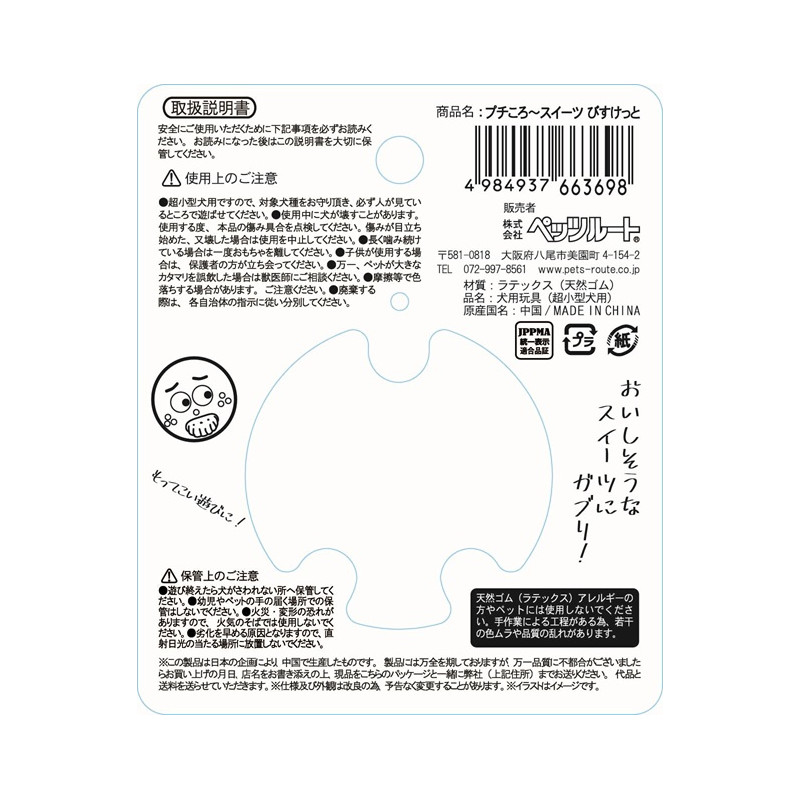 | 注意事項 | 【使用上の注意】 ●本品は犬用ですので他のペットには使用しないでください。対象犬種はパピー・超小型ですので必ずお守りください。 ※その他の小・中・大型犬にはご使用しないでください。 ●本品は必ず人が見ている所でご使用してください。 ●使用前に本品が破損していないか確認してください。破損がある場合は使用を中止してください。 ●お子様が使用する場合は、安全の為大人が立ち会ってください。 ●万一、愛犬が本品破損の一部を誤飲した場合は獣医師にご相談ください。 ●廃棄する際は、各自治体の指示に従い分別してください。 |
