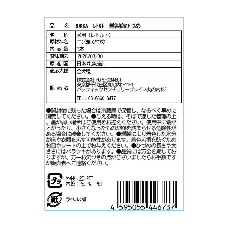 | 注意事項 | ●与える時は、そばで適した管理の上、歯が弱い場合はご使用をお控えください。使用中に端がとがったり、小さくなったものが喉を詰まらせる危険性がある場合は破棄してください。 ●燻製により、着色した水分が床や衣類を汚す可能性があります。 ●健康状態や年齢、運動量等を考慮した上で、副食として1日総カロリーの10~20%内を目安にお与えください。 |
